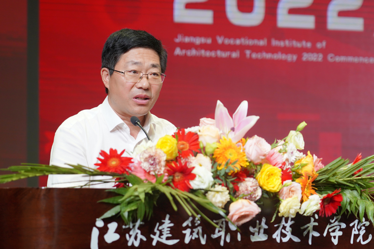 沈士德为“心中的恩师”、“最美守护者”颁发荣誉证书并致辞。他在致辞中代表学校对4506名圆满完成学业的2022届毕业生表示祝贺,向教诲毕业生成才的师长、养育毕业生成长的家长致以感谢。沈士德带领大家简要回顾了三年大学生涯中的“独家记忆”,“新中国70华诞”“建党100周年”“新冠病毒肺炎疫情”“建校40周年”等。为帮助和启迪全体毕业生在未来工作、学习、生活道路上进一步做好人生规划,沈士德送上三条寄语:一要坚定理想信念,增强做“铮铮铁骨”建院人的志气,继续传承好学校的文化与精神,努力成长为有理想、敢担当、能作为的新时代青年;二要坚持拼搏奋斗,增强做“勇毅笃行”建院人的骨气,大力弘扬劳模精神、劳动精神、工匠精神,守护好尊严与荣耀,争做新时代的实干家;三要坚持精益求精,增强做“矢志创新”建院人的底气,努力从技术技能人才向能工巧匠、大国工匠转变,以真才实学服务社会,创造出更多成就与辉煌。