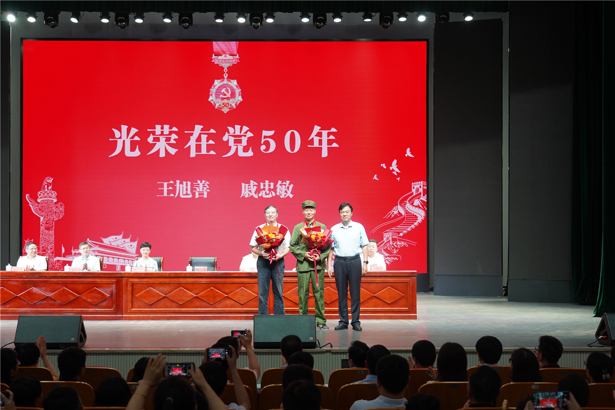 孙进代表学校党委向“光荣在党50年”老党员致以崇高敬意,向受到表彰的先进集体和个人表示祝贺。他带领大家重点学习了中国共产党艰苦卓绝的奋斗历史,并简要回顾了学校近一年来在基层党建、干部队伍建设、党史学习教育、全面从严治党、三全育人、疫情防控等方面取得的成绩与成效。为动员和激励全体党员创先争优,更好地推动学校事业健康发展,孙进就做好今后一个时期的工作向全体与会人员提出三点意见:一是要增强历史自觉,凝聚学校事业发展磅礴力量,努力用高质量党建引领学校各项事业高质量发展;二是要坚定理想信念,开创学校提升发展生动局面,持续提升学校的综合办学实力和竞争发展能力;三是要站稳人民立场,续写学校事业发展崭新篇章,承担起为党育人、为国育才的使命担当。