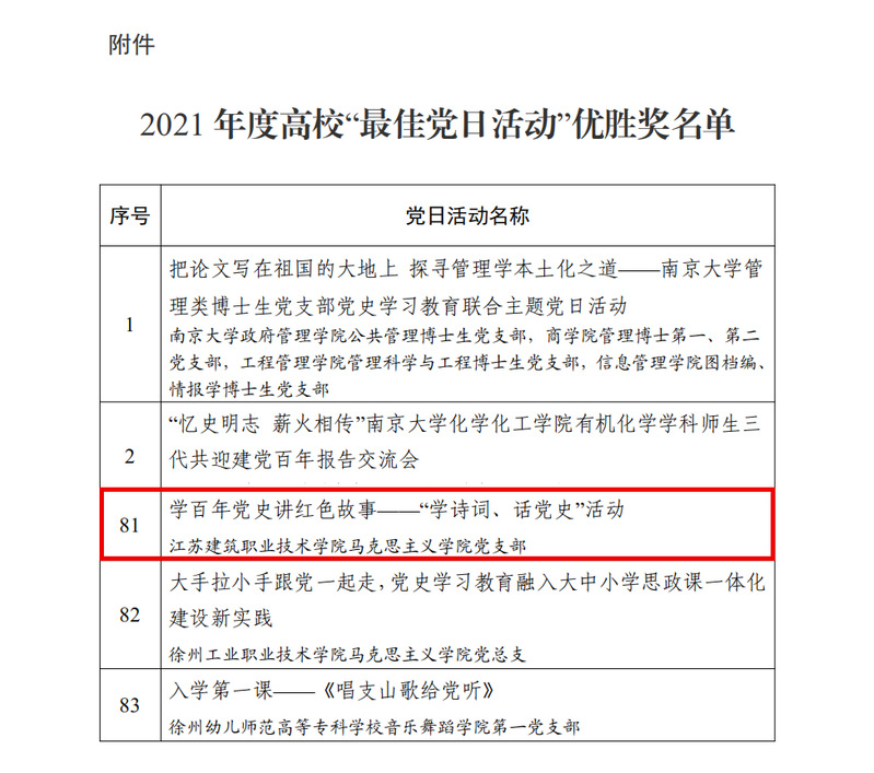 日前,江苏省委教育工委公布了2021年度高校“最佳党日活动”优胜奖评选结果,MK(中国)马克思主义学院党支部开展的“学百年党史讲红色故事——学诗词、话党史”主题党日活动获2021年度高校“最佳党日活动”优胜奖。