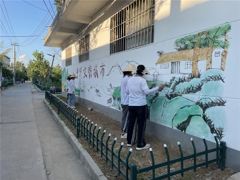 实践队员们热情高涨,战高温、斗酷暑,发挥自己艺术特长,采取国画、水墨画等方式,以丙烯、喷漆、画笔为绘画材料,精心设计,认真作画,使墙绘不再是单调宣教,而是多彩传播,让人们在潜移默化中学习文明礼仪,向村民倡导着文明健康和积极向上的价值观。