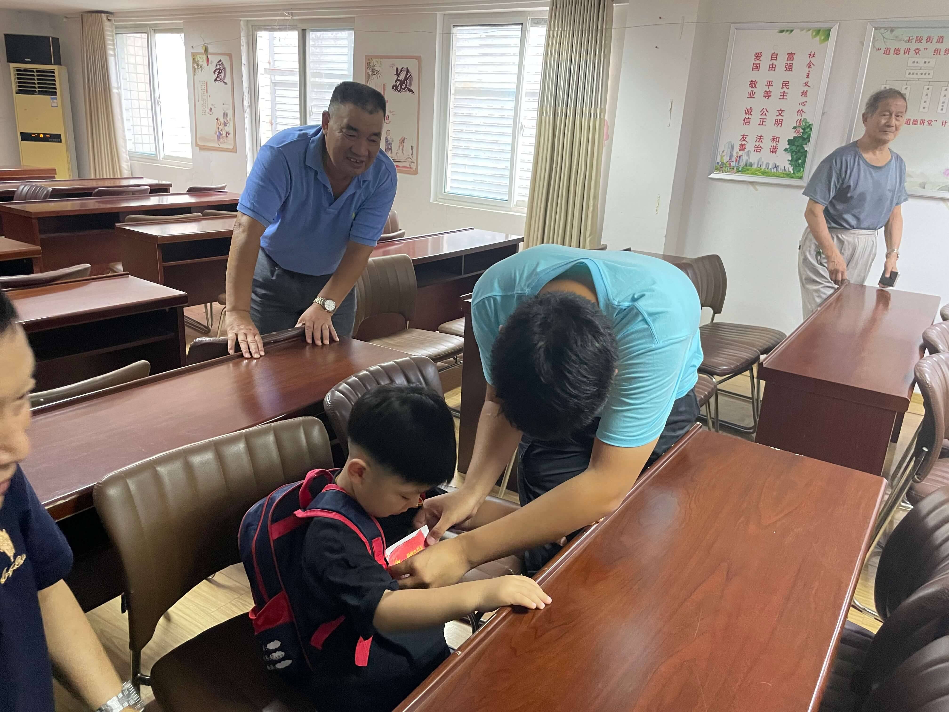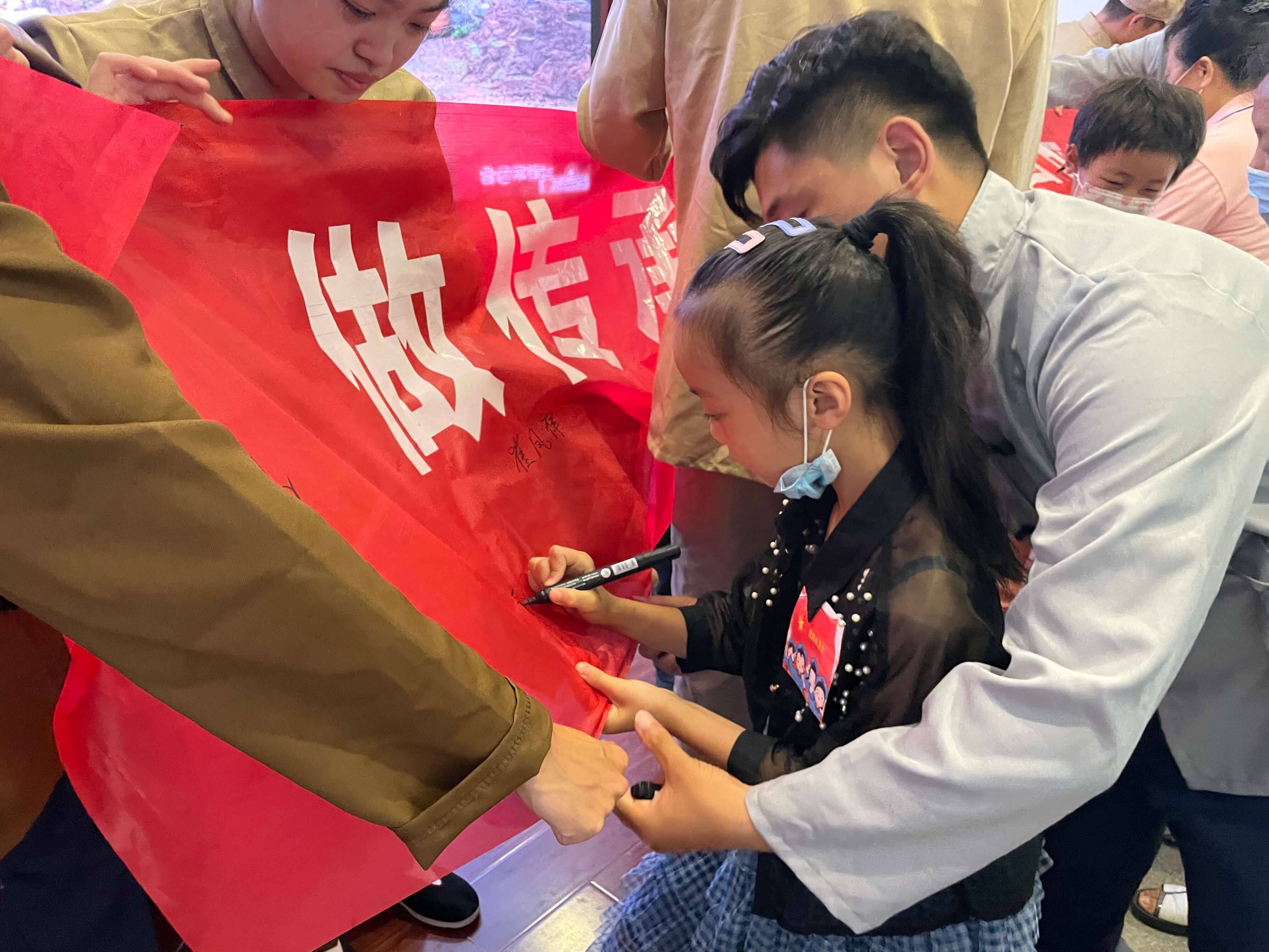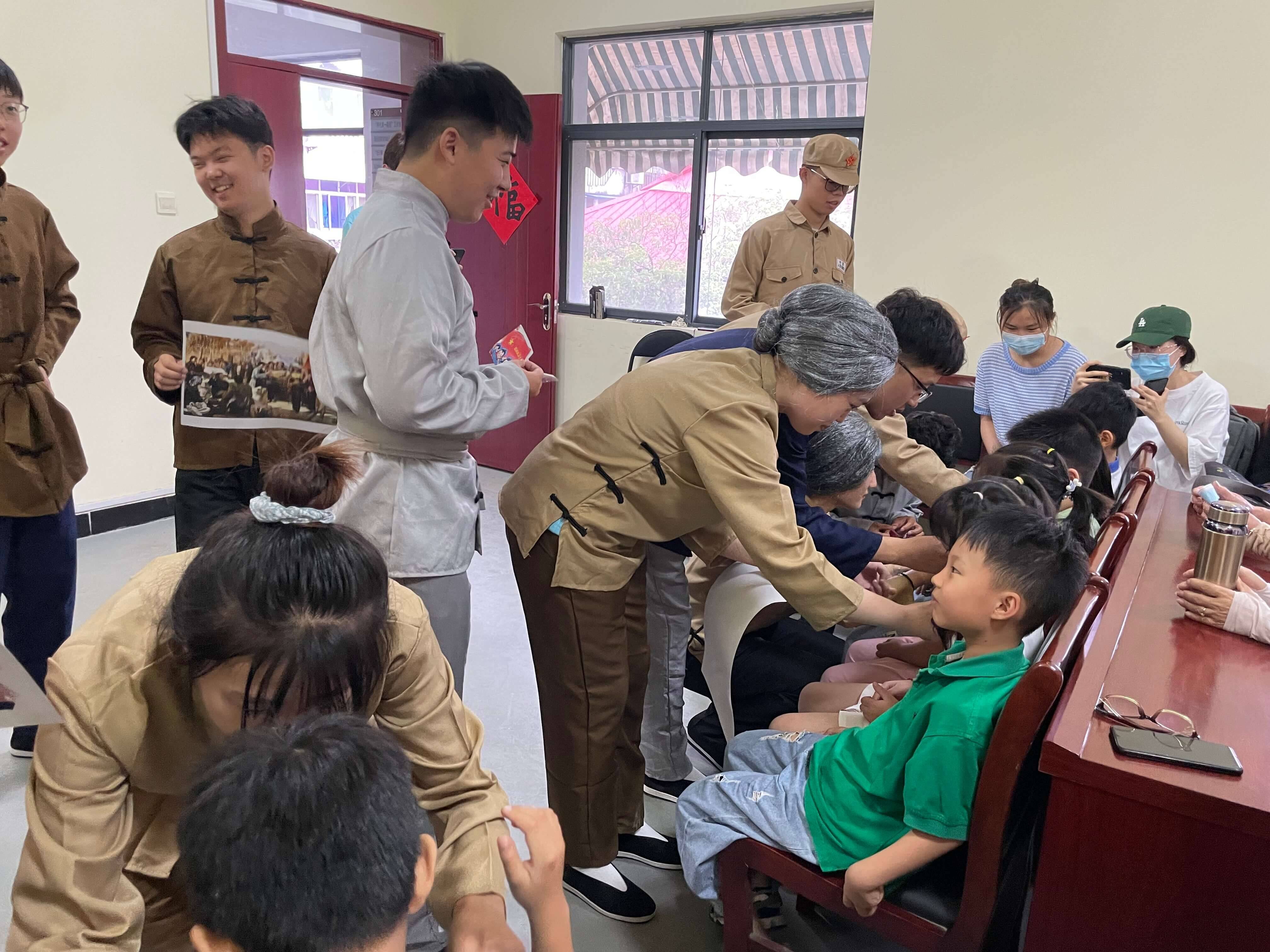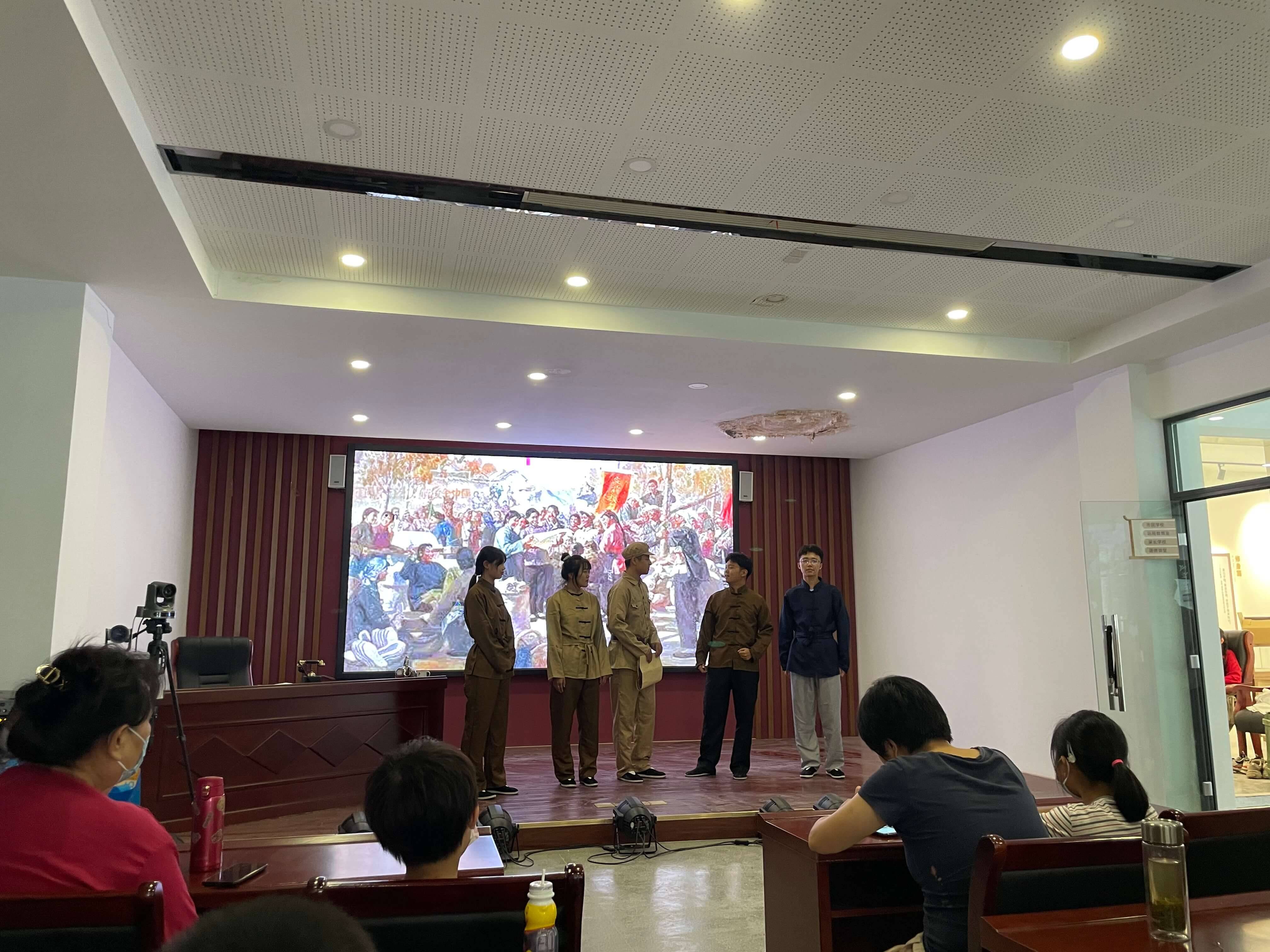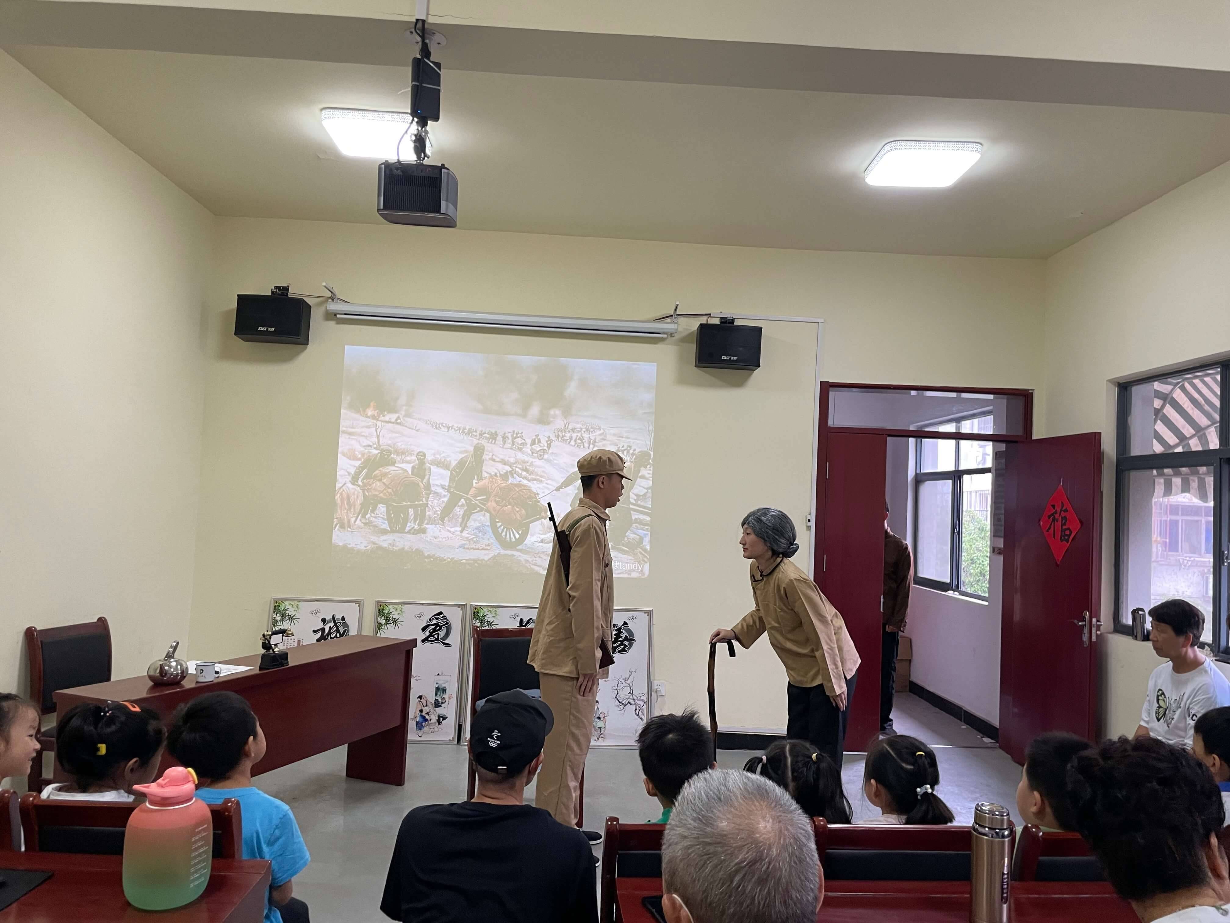 为了响应实践团“红色浸初心、星火永相传”的活动宗旨,特邀社区儿童、退休老党员参与并观看剧目,在社区的活动室里,团员成员们拿上道具,进行布景,以饱满的热情投入到演出当中,棉布袋子的故事、民站的展现、民工的工作场景以及许多支前路上的真实事迹被刻画与塑造,让在场的孩子、老人在同学们质朴的表演下重温淮海战役上可爱的、令人尊敬的人民群众们的伟岸身影,为观众们提供一场活灵活现的党史学习。表演结束后,团队成员为儿童贴上红色小卫士勋章,邀请老党员们为传承红色文化签名,并与在场老党员们沟通交流有关表演内容与历史重现上的改进与创新。