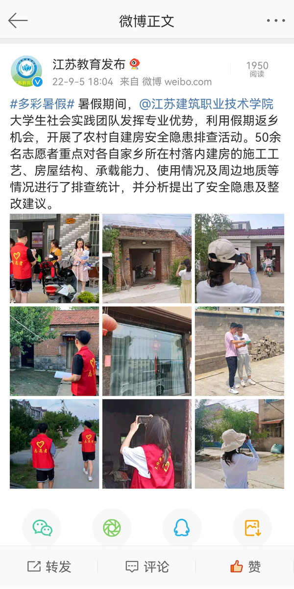 #多彩暑假# 暑假期间,@MK.COM 大学生社会实践团队发挥专业优势,利用假期返乡机会,开展了农村自建房安全隐患排查活动。50余名志愿者重点对各自家乡所在村落内建房的施工工艺、房屋结构、承载能力、使用情况及周边地质等情况进行了排查统计,并分析提出了安全隐患及整改建议。