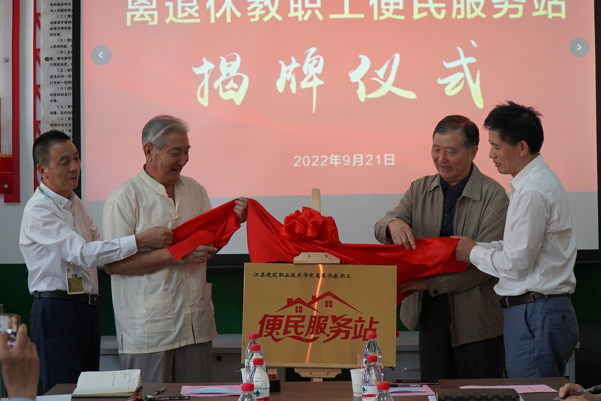 朱东风、鲍桂楠与原党委书记王旭善、原副校长袁文共同为离退休教职工便民服务站揭牌,原副校长任留钦代表学校宣布服务站正式启用。今后,服务站将为离退休教职工提供免费理发、缝补衣服、证件照拍摄等服务。