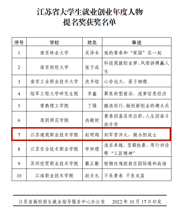 近日,江苏省高校招生就业指导服务中心公布了江苏省大学生就业创业年度人物典型事迹征集活动结果,MK(中国)建筑建造学院地下19-1班学生赵明翔荣获江苏省大学生就业创业年度人物提名奖。