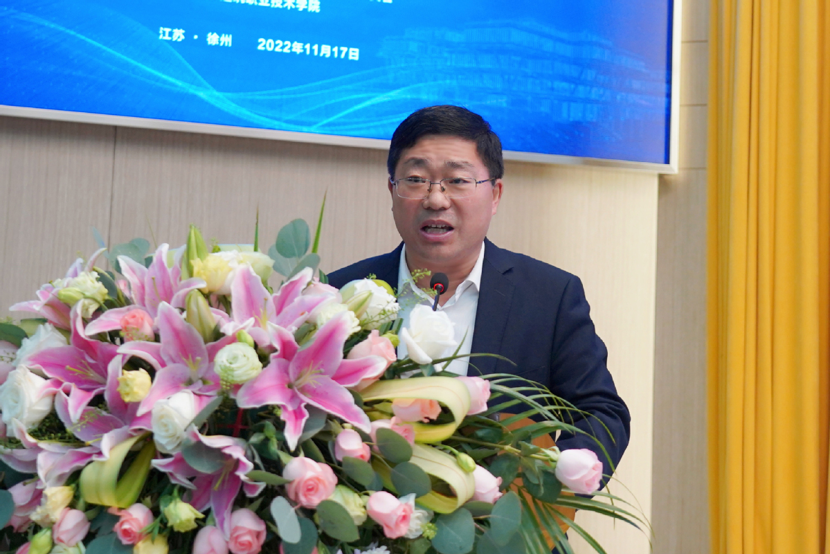 沈士德代表学校致辞,他向与会领导嘉宾表示热烈欢迎,重点介绍了学校的发展概况及在绿色建筑与智能建造方面取得的成绩,提出了学校明确以建筑工业化、数字智能化、绿色低碳化为方向,以国家“双高计划”为驱动,以创建全国一流智能建造特色鲜明的职教本科为目标,努力为绿色城乡建设和“强富美高”新江苏发展培养更多高素质技术技能人才。
