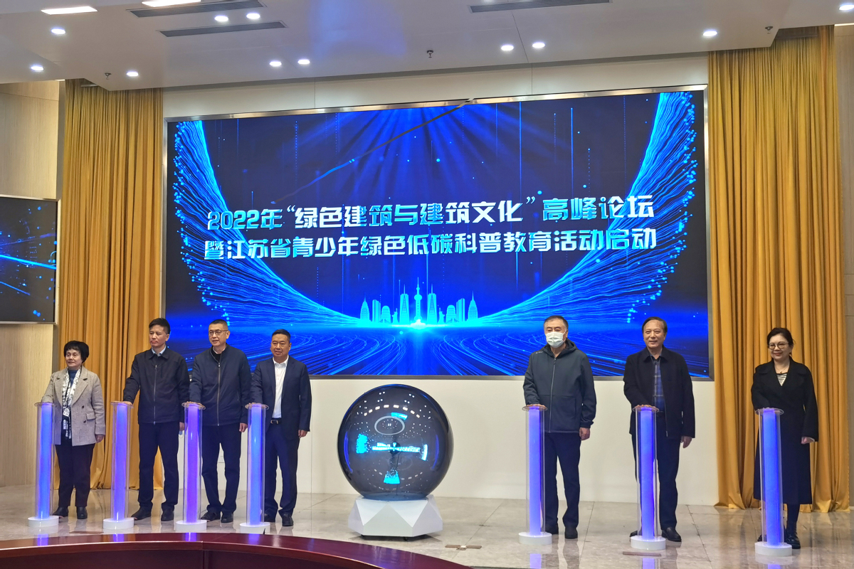 林斌、杜学伦、章小刚、王有党、朱东风、刘宇红、成宁共同为2022年“绿色建筑与建筑文化”高峰论坛暨江苏省青少年绿色低碳科普教育活动按下启动键。