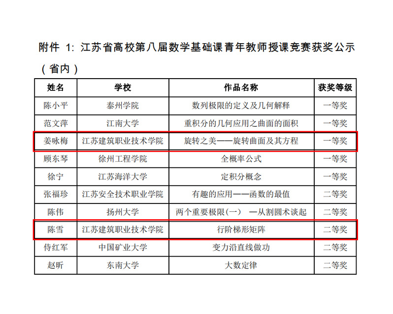 近日,江苏省高校第八届数学基础课青年教师授课竞赛暨第二届全国大学数学课程思政邀请赛获奖名单公布,MK(中国)公共基础学院姜咏梅老师主讲的《旋转之美——旋转曲面及其方程》获一等奖,陈雪老师主讲的《行阶梯形矩阵》获二等奖。