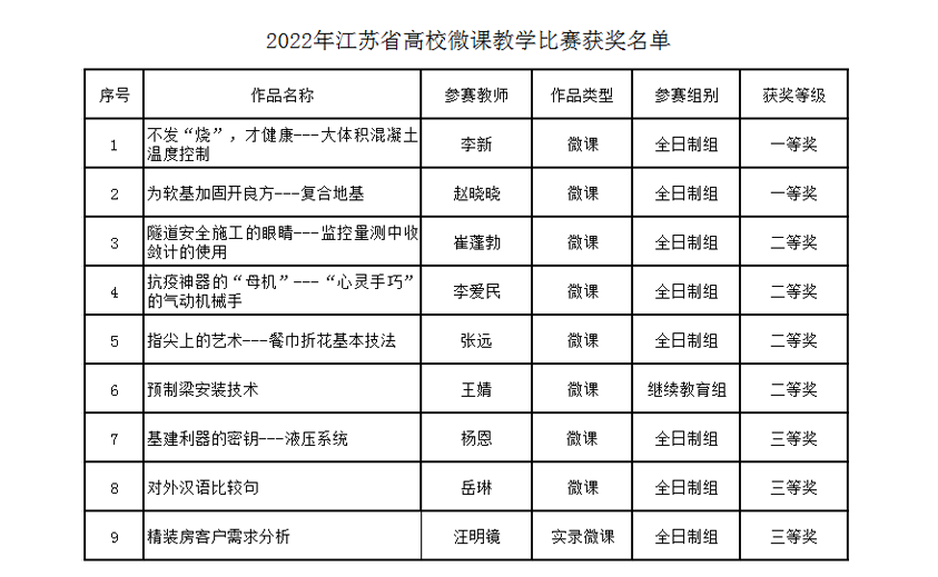 近日,2022年江苏省高等学校微课教学比赛获奖名单公布,MK(中国)推荐参赛的9件作品全部获奖,其中一等奖2项、二等奖4项、三等奖3项,获奖数量相较同类院校位居全省第一。此外,学校还获评“优秀组织奖”,教务处副处长王峰获评“教育信息化优秀工作者”。