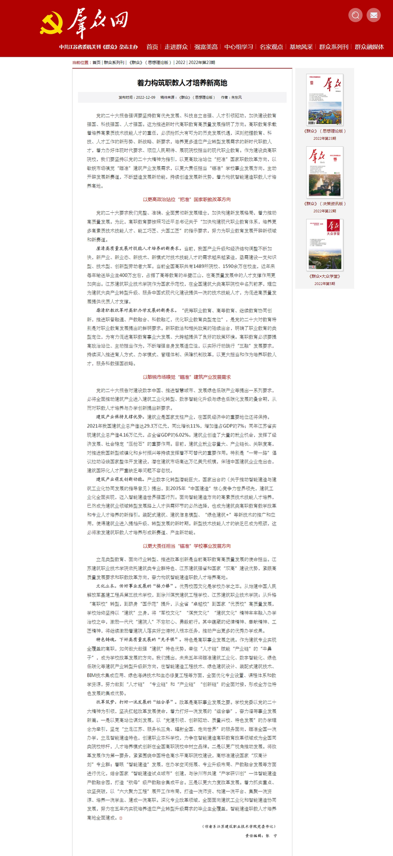12月9日出版的《群众》杂志以《着力构筑职教人才培养新高地》为题,刊登校党委书记朱东风的署名文章。