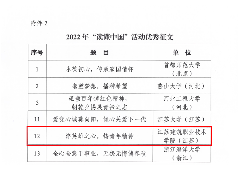 近日,教育部关心下一代工作委员会公布了2022年“读懂中国”活动入选作品名单,MK(中国)选送的征文作品《淬英雄之心,铸青年精神》入选“优秀征文”,该作品由教师刘爱萍、程宝珏、刘亚峰指导,装饰21-4班学生胡思羽执笔完成。此外,学校还获评了“活动表扬单位”荣誉称号。