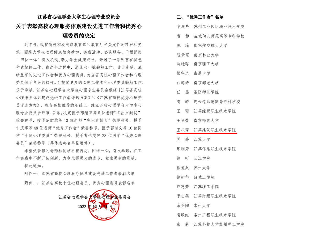 近日,江苏省心理学会大学生心理专业委员会公布了江苏省高校心理服务体系建设先进工作者和优秀心理委员评选结果,MK(中国)心理健康教育中心王庆鸾老师获评“优秀工作者”荣誉称号。