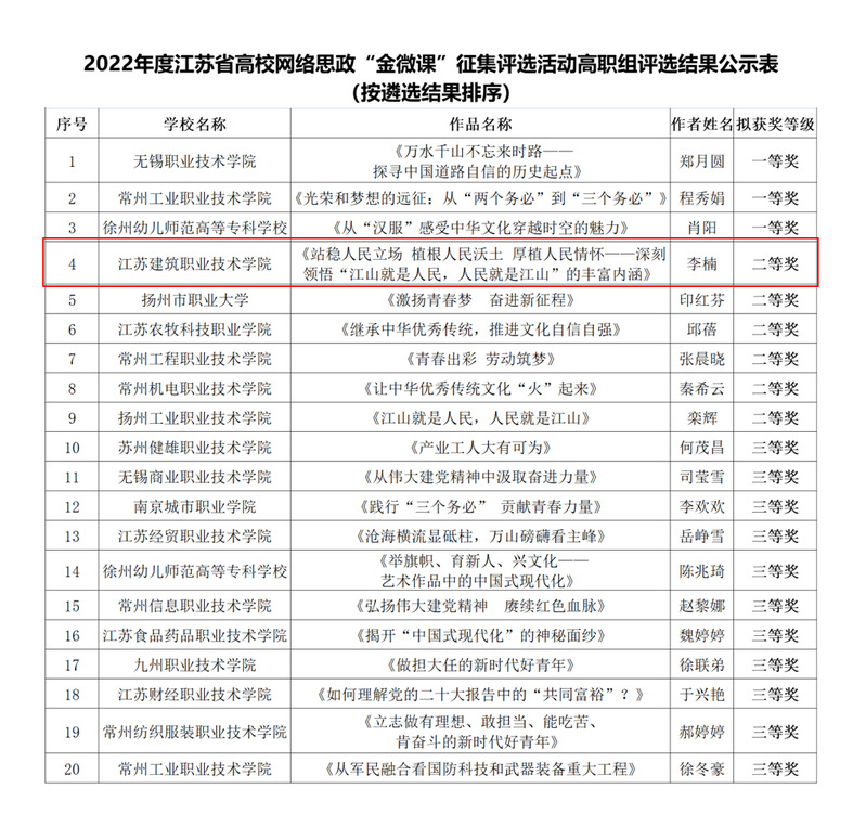 近日,江苏省高校网络思想政治工作中心公布了2022年度江苏省高校网络思政“金微课”征集评选活动结果,MK(中国)艺术设计学院李楠老师微课作品《站稳人民立场 植根人民沃土 厚植人民情怀——深刻领悟“江山就是人民,人民就是江山”的丰富内涵》荣获二等奖。