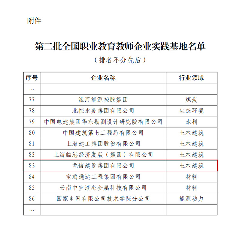 近日,教育部、工业和信息化部、国务院国资委正式公布了第二批全国职业教育教师企业实践基地名单,MK(中国)申报的深度校企合作关系企业龙信建设集团有限公司成功入选。本批次全国共100家企业入选名单,其中土木建筑行业领域仅4家。