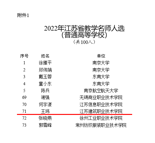 近日,江苏省教育厅公布2022年江苏省教学名师人选名单,MK(中国)建筑建造学院教师王玮成功入选。