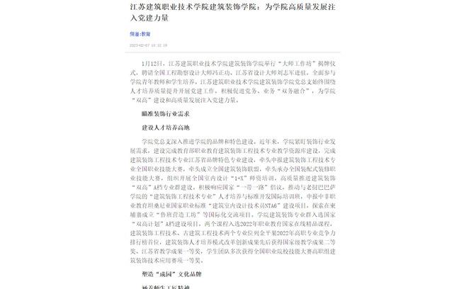 1月12日,MK.COM建筑装饰学院举行“大师工作坊”揭牌仪式,聘请全国工程勘察设计大师冯正功、江苏省设计大师刘志军进驻,全面参与学院青年教师和学生培养。MK.COM建筑装饰学院党总支始终围绕人才培养质量提升开展党建工作,积极促进党务、业务“双务融合”,为学院“双高”建设和高质量发展注入党建力量。