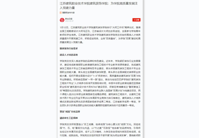 学院党总支深入推进学院的品牌和特色建设。近年来,学院紧盯装饰行业发展需求,建设完成教育部职业教育建筑装饰工程技术专业教学资源库建设,完成建筑装饰工程技术专业江苏省品牌特色专业建设,牵头申报建筑装饰工程技术专业全国职业技能大赛,牵头成立全国建筑装饰联盟,牵头承办全国装配式装修职业技能大赛,组织开展全国室内设计“1+X”师资培训,高质量推进建筑装饰“双高”A档专业群建设。积极响应国家“一带一路”倡议,推动与老挝巴巴萨学院的“建筑装饰工程技术专业”人才培养与标准开发国际培训班,申报中非职业教育坦桑尼亚国家职业标准“建筑室内设计技术员NTA6”建设项目,探索在柬埔寨成立“鲁班营造工坊”等国际化交流项目。学院建筑装饰专业群入选国家“双高计划”A档建设项目,两个课程入选2022年职业教育国家在线精品课程,建筑装饰工程技术、古建筑工程技术两个专业位列金平果2022年高职专业竞争力排行榜首位,建筑装饰人才培养模式改革创新成果先后获得国家级教学成果二等奖、江苏省教学成果一等奖,学生团队多次获得全国职业院校技能大赛高职组建筑装饰技术应用赛项一等奖。