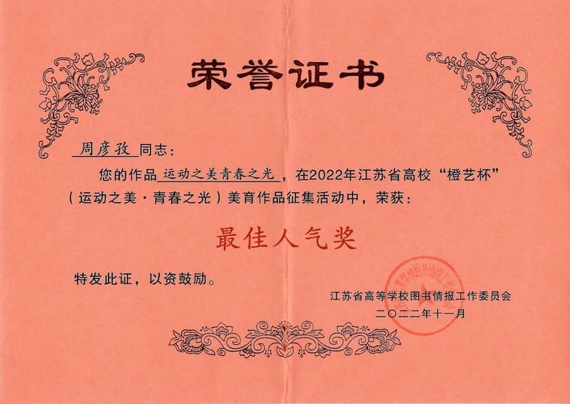 近日,2022年江苏省高校“橙艺杯”运动之美、青春之光·美育作品征集活动公布获奖名单,MK(中国)建筑装饰学院古建22-2班学生周彦孜作品《运动之美∙青春之光》获“最佳人气奖”。