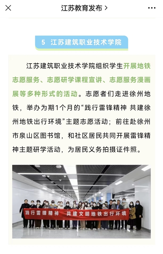 MK.COM组织学生开展地铁志愿服务、志愿研学课程宣讲、志愿服务漫画展等多种形式的活动。志愿者们走进徐州地铁,举办为期1个月的“践行雷锋精神 共建徐州地铁出行环境”主题志愿活动;前往赴徐州市泉山区图书馆,和社区居民共同开展雷锋精神主题研学活动,为居民义务拍摄证件照。