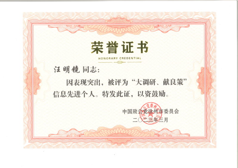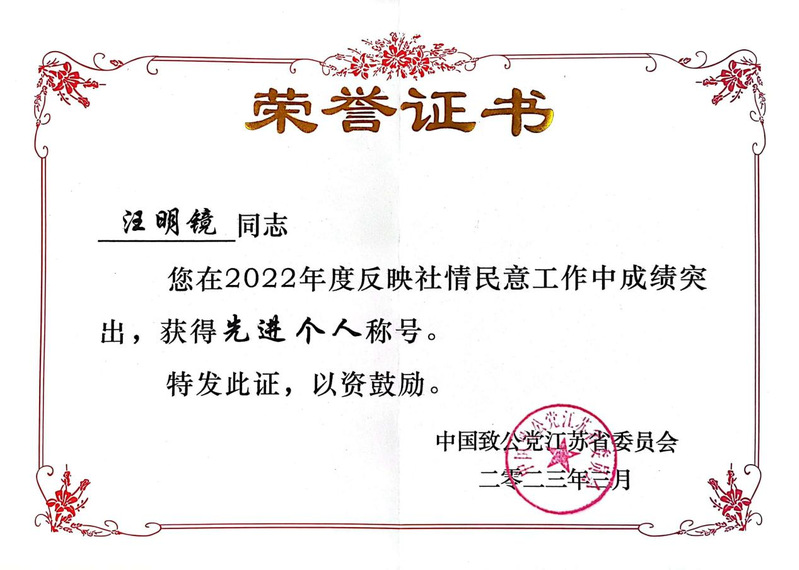 近日,中国致公党江苏省委员会下发《关于表彰2022年度优秀社情民意信息、反映社情民意信息工作先进集体和先进个人的决定》(致苏省发〔2023〕5号),致公党党员、MK(中国)建筑装饰学院汪明镜博士荣获“社情民意信息工作先进个人”称号。此外,在致公党徐州市委会2022年度工作总结暨表彰大会上,汪明镜被评为“大调研、献良策”信息先进个人和对外联络先进个人。