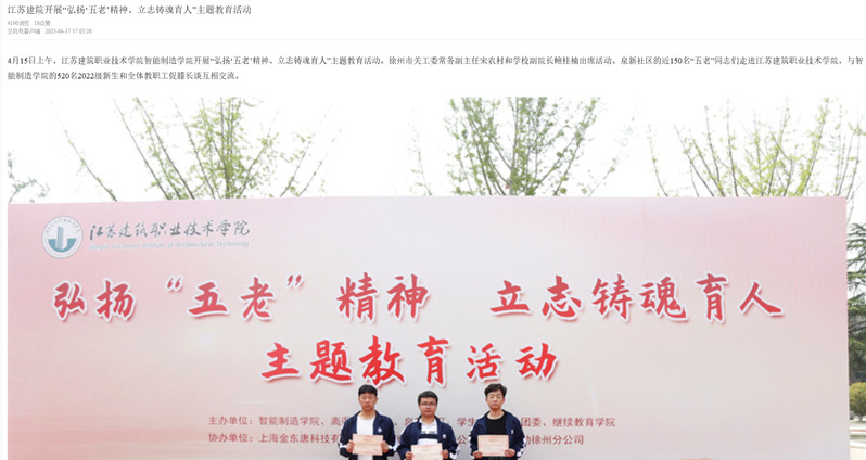 徐州市关工委常务副主任宋农村为青年学生们发表了热情洋溢的讲话,他说到江苏建院作为国家示范性高职学院、国家优质高职院校、国家“双高计划”建设单位,办学40多年以来,为国家和社会培养了大量优秀人才。学校关工委在深入推进校、院两级关工委优质化建设方面,成绩斐然,学校关工委多次被评为“全国教育系统关心下一代工作先进集体”。