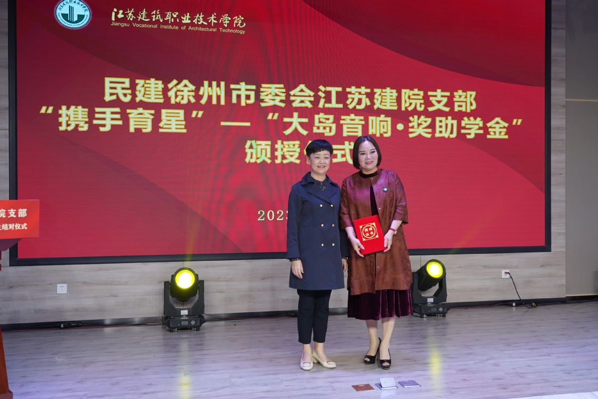 仪式上,梁惠为民建徐州市委会员企业捐赠者大岛音响电器工程有限公司颁发证书,民建江苏建院支部主委刘胜勇、校团委书记柏东良、民建徐州市委会专职副主委王奉君分别为“携手育星”获奖学生颁发奖金和证书。