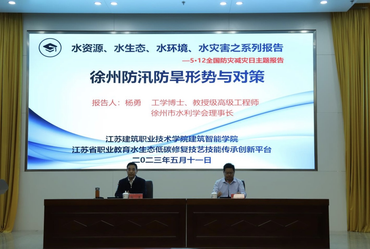 5月11日下午,为迎接第15个“5·12全国防灾减灾日”,建筑智能学院联合徐州市水务局、徐州市水利学会、徐州市科技协会共同举办“防范灾害风险,护航高质量发展”主题报告会。报告会由徐州市水务局局长杨勇主讲,徐州市科协副主席刘克强、徐州市水利学会秘书长刘奉等出席,建筑智能学院院长陈益武主持。