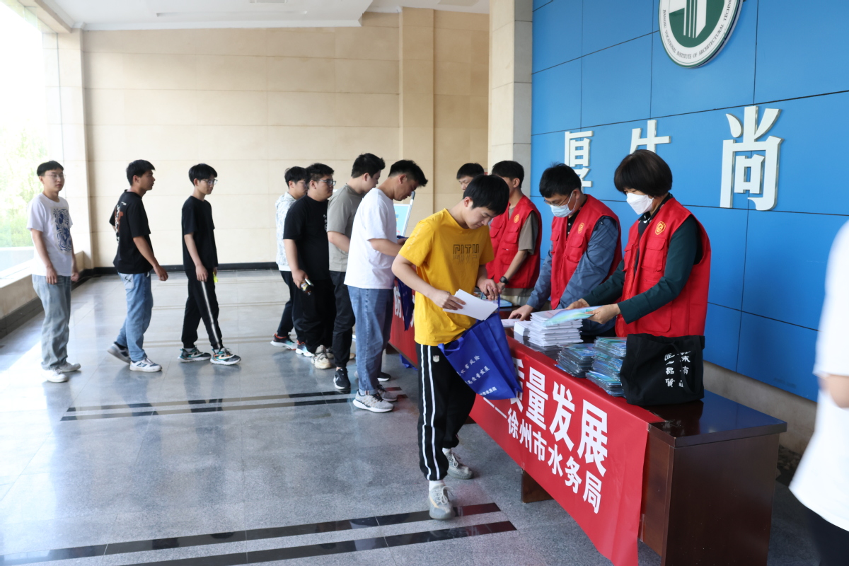 报告会前,由市水务局科监处、政法处、水利学会等单位组成的10余名科普志愿者团队,向前来听报告的同学们发放了精心编印的“防汛减灾、水资源保护、再生水利用”科普宣传彩页、水务行业法律法规手册及印有宣传主题标语的环保袋等。
