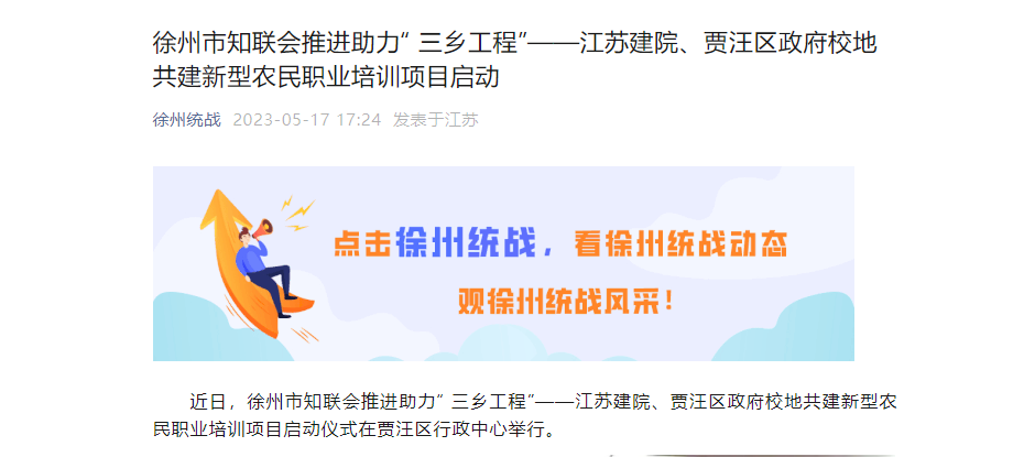 近日,徐州市知联会推进助力“ 三乡工程”——江苏建院、贾汪区政府校地共建新型农民职业培训项目启动仪式在贾汪区行政中心举行。