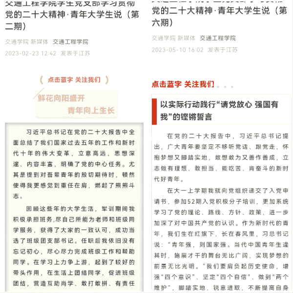 充分利用微信公众号网络新媒体,开设“学习贯彻党的二十大精神 青年大学生说”特色栏目,发挥学生党员骨干的榜样示范作用,带动全体学生主动学习二十大精神。