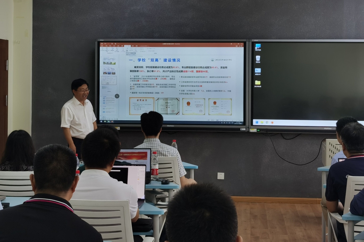 会上,沈士德回顾了学校“双高”建设历程,总结了学校建设情况,指出了当前建设过程中存在的不足,并针对下一阶段工作提出了三点要求:一是要重点关注两个“侧重点”,即建设经验总结和中央最新改革举措落实;二是要着力推进三个“相统一”,即实践与战略相统一、绩效与项目相统一、贡献与定位相统一;三是要奋力确保一个“好成绩”。刘海波详细介绍了下半年“双高”建设重点工作任务,并提出进一步压实责任、确保任务落地执行这一工作要求。
