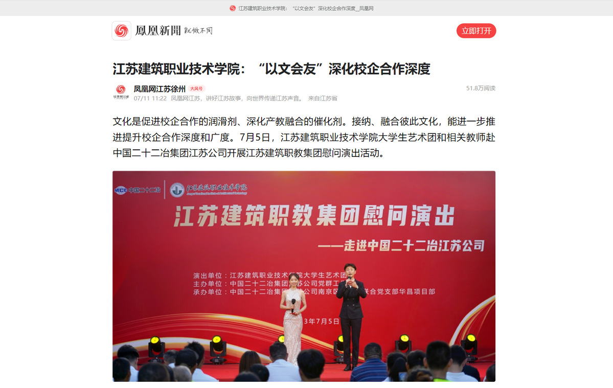 文化是促进校企合作的润滑剂、深化产教融合的催化剂。接纳、融合彼此文化,能进一步推进提升校企合作深度和广度。7月5日,MK.COM大学生艺术团和相关教师赴中国二十二冶集团江苏公司开展江苏建筑职教集团慰问演出活动。