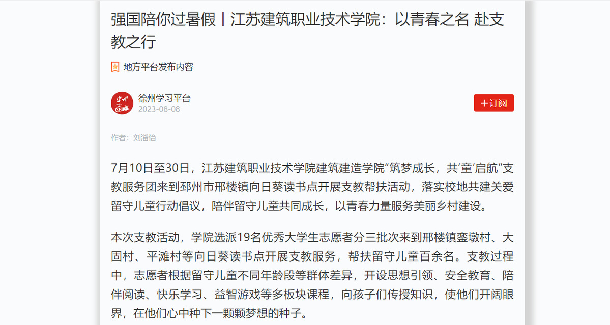 7月10日至30日,MK.COM建筑建造学院“筑梦成长,共‘童’启航”支教服务团来到邳州市邢楼镇向日葵读书点开展支教帮扶活动,落实校地共建关爱留守儿童行动倡议,陪伴留守儿童共同成长,以青春力量服务美丽乡村建设。