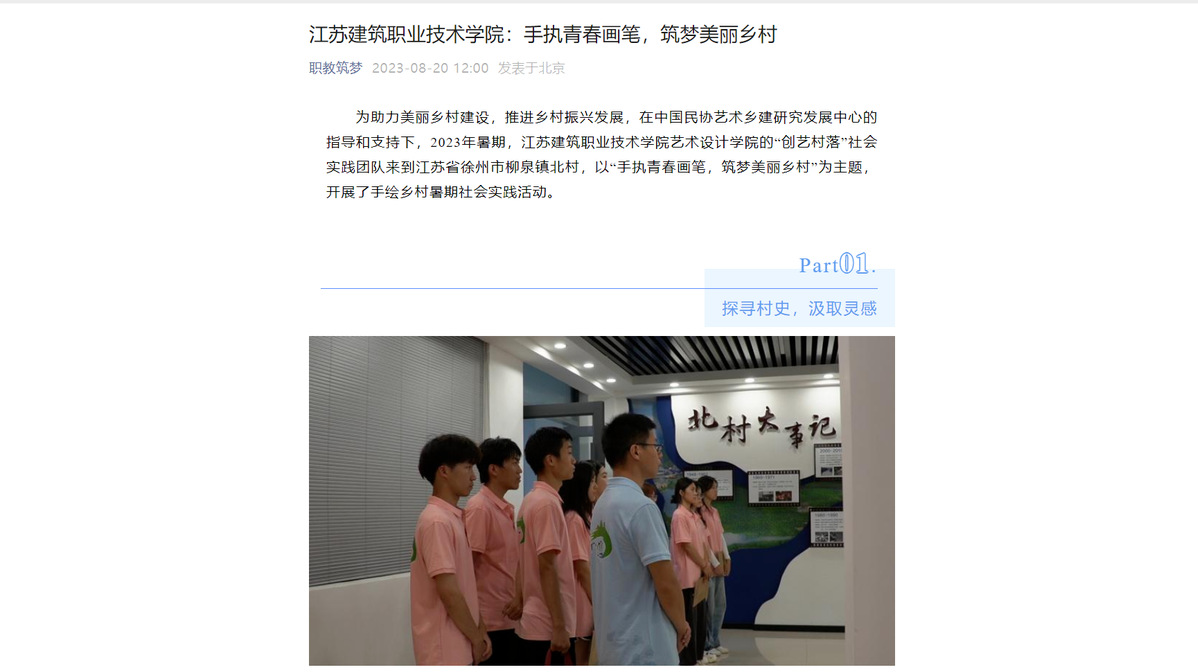 为助力美丽乡村建设,推进乡村振兴发展,在中国民协艺术乡建研究发展中心的指导和支持下,2023年暑期,MK.COM艺术设计学院的“创艺村落”社会实践团队来到江苏省徐州市柳泉镇北村,以“手执青春画笔,筑梦美丽乡村”为主题,开展了手绘乡村暑期社会实践活动。