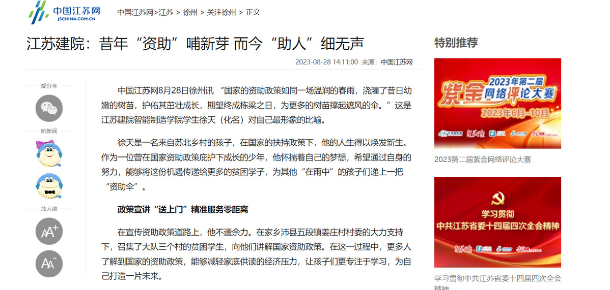 中国江苏网8月28日徐州讯 “国家的资助政策如同一场温润的春雨,浇灌了昔日幼嫩的树苗,护佑其茁壮成长,期望终成栋梁之日,为更多的树苗撑起遮风的伞。”这是江苏建院智能制造学院学生徐天(化名)对自己最形象的比喻。