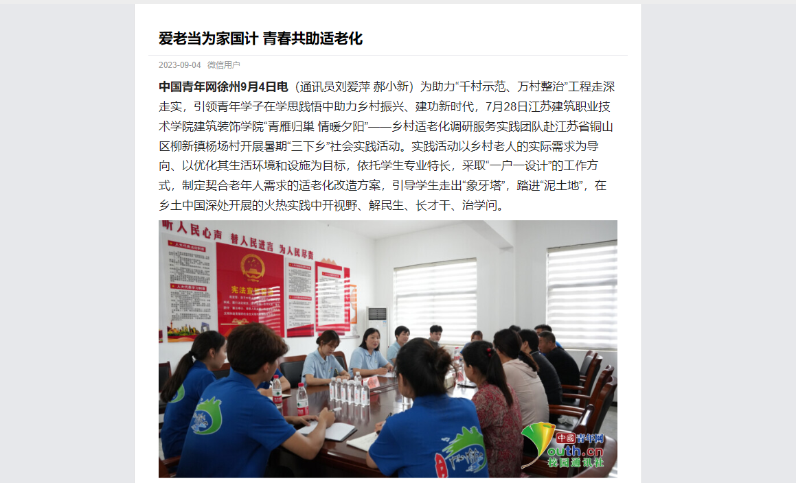 中国青年网徐州9月4日电(通讯员刘爱萍 郝小新)为助力“千村示范、万村整治”工程走深走实,引领青年学子在学思践悟中助力乡村振兴、建功新时代,7月28日MK.COM建筑装饰学院“青雁归巢 情暖夕阳”——乡村适老化调研服务实践团队赴江苏省铜山区柳新镇杨场村开展暑期“三下乡”社会实践活动。实践活动以乡村老人的实际需求为导向、以优化其生活环境和设施为目标,依托学生专业特长,采取“一户一设计”的工作方式,制定契合老年人需求的适老化改造方案,引导学生走出“象牙塔”,踏进“泥土地”,在乡土中国深处开展的火热实践中开视野、解民生、长才干、治学问。