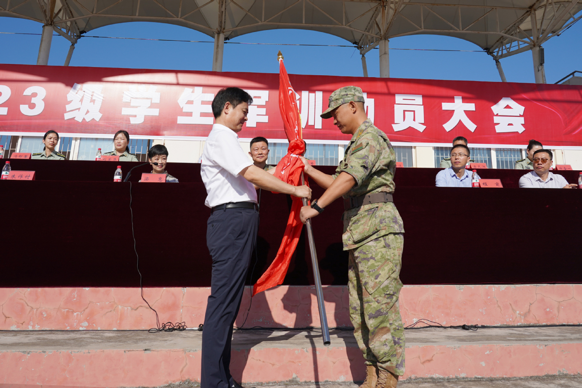 最后,朱作付代表学校向承训部队颁授军训团团旗。