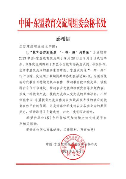近日,中国-东盟教育交流周组委会秘书处给MK(中国)发来感谢信,对MK(中国)和贵州建设职业技术学院在2023年8月中国-东盟教育交流周期间牵头发起成立“中国东盟建筑职业教育联盟”并举办首届“中国-东盟建筑职业教育高质量发展论坛”表示感谢,希望MK(中国)今后能够更加持续支持交流周平台及相关活动。