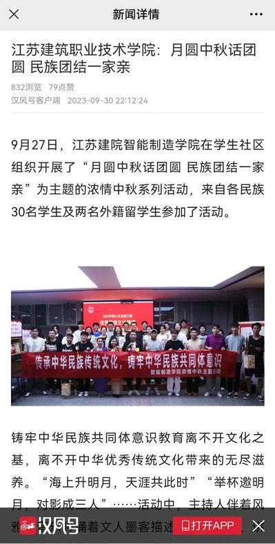 9月27日,江苏建院智能制造学院在学生社区组织开展了“月圆中秋话团圆 民族团结一家亲”为主题的浓情中秋系列活动,来自各民族30名学生及两名外籍留学生参加了活动。