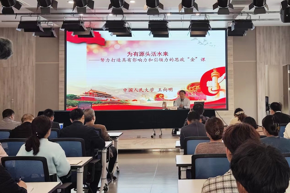 讲座中,王向明围绕“努力打造具有影响力和引领力的思政金课”这一主题,从“坚定信仰、理论扎实”“教师为本、人格要正”“讲清道理、注重方法”三个维度,结合自身学术研究和教学实践,就如何提高思政课影响力、引领力指明了教学进阶路径。他讲授了“用坚定的信仰引领人,用真理的力量感召人,用高尚的人格感染人,用真挚的情感打动人,用生动的形式吸引人”的丰富内涵和具体要求,并鼓励教师们不懈追求、持续完善,打造出一堂堂沟通心灵、启智润心、激扬斗志的好课。