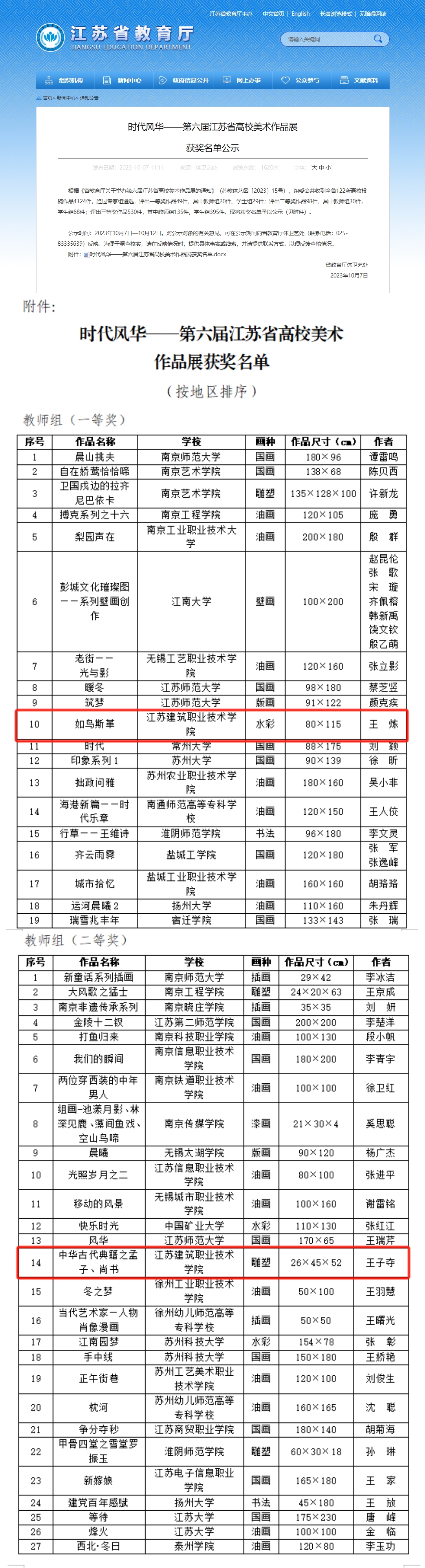 近日,江苏省教育厅公布了第六届“时代风华—江苏省高校美术作品展”获奖名单,MK(中国)建筑装饰学院教师王炼的水彩作品《如鸟斯革》、王子夺的雕塑作品《中华古代典籍之孟子·尚书》分获教师组一、二等奖,古建21-2班王佳慧的水彩作品《物语——榴金岁月之二》(指导教师:王炼)获学生组三等奖。