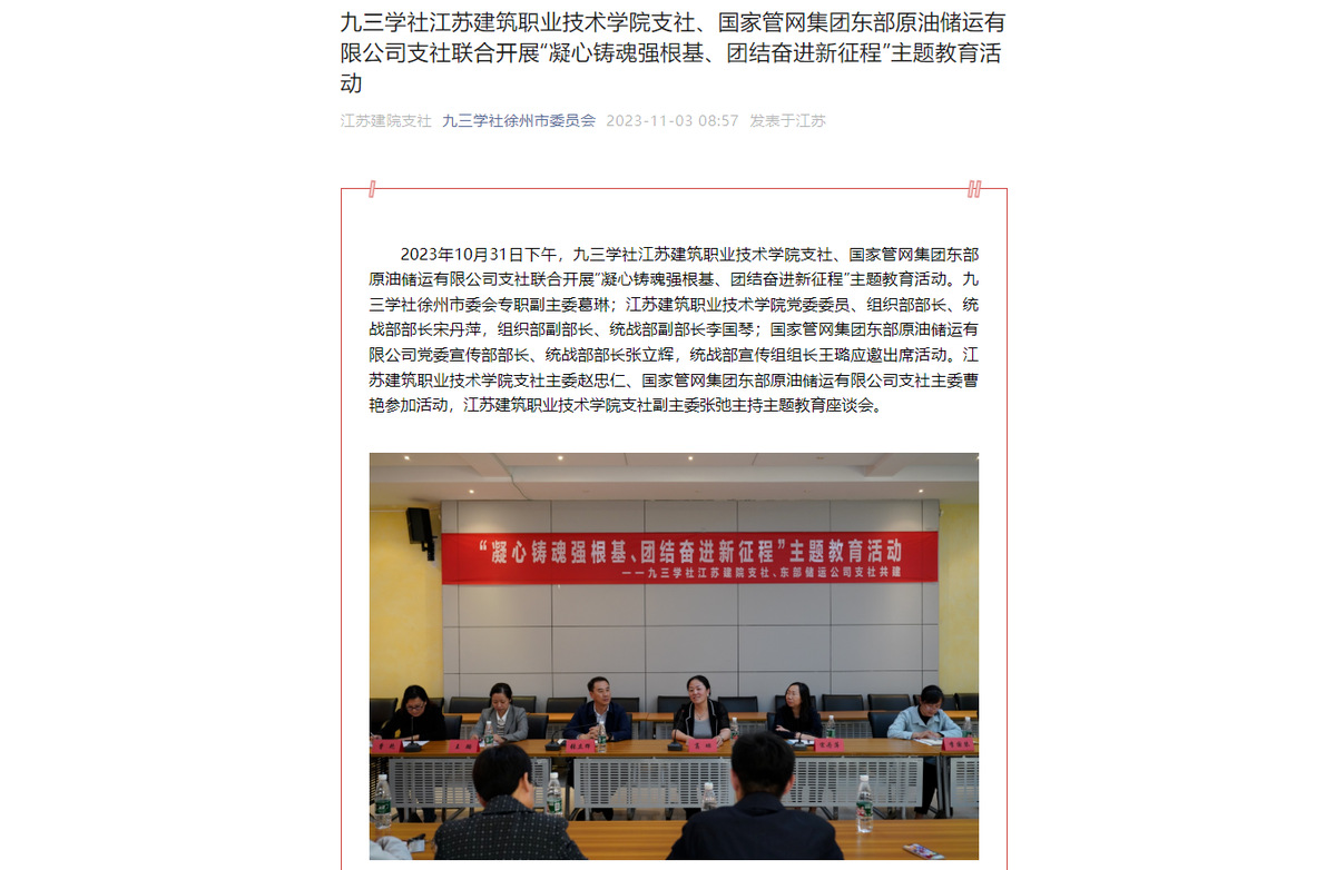 2023年10月31日下午,九三学社MK.COM支社、国家管网集团东部原油储运有限公司支社联合开展“凝心铸魂强根基、团结奋进新征程”主题教育活动。九三学社徐州市委会专职副主委葛琳;MK.COM党委委员、组织部部长、统战部部长宋丹萍,组织部副部长、统战部副部长李国琴;国家管网集团东部原油储运有限公司党委宣传部部长、统战部部长张立辉,统战部宣传组组长王璐应邀出席活动。MK.COM支社主委赵忠仁、国家管网集团东部原油储运有限公司支社主委曹艳参加活动,MK.COM支社副主委张弛主持主题教育座谈会。