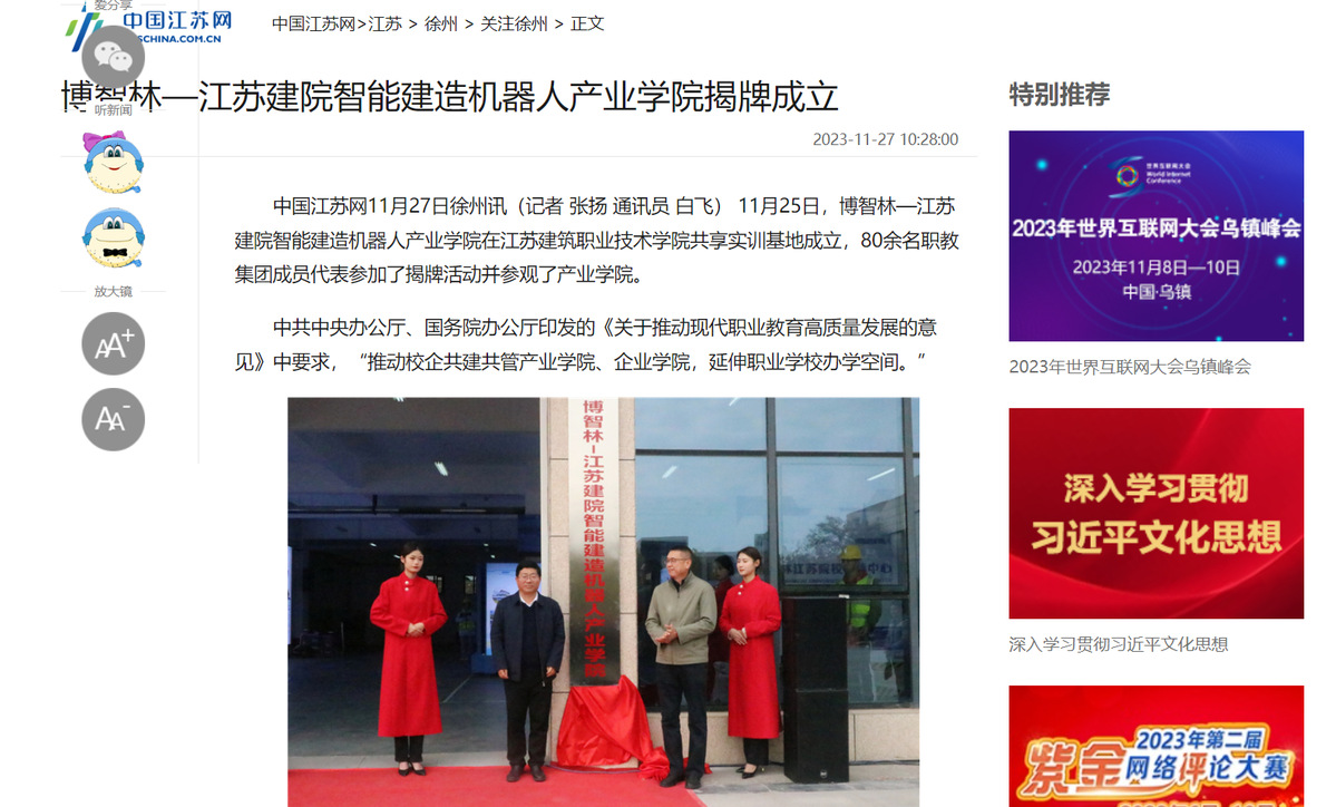 接下来,学校将依托博智林-江苏建院智能建造机器人产业学院,创新人才培养模式、提升专业建设质量、打造实习实训基地、搭建产学研服务平台,促进人才培养供需双方紧密对接,实现学校与产业、学校与企业之间信息、人才、技术与物质资源共享。