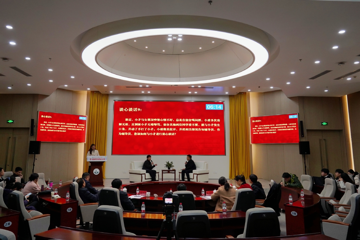 本次大赛共有初赛与决赛两个部分,经过笔试初赛选拔,最终有30名辅导员进入决赛。决赛包括案例研讨和谈心谈话两个环节。案例研讨环节中,参赛辅导员紧扣案例核心,旁征博引,抽丝剥茧,围绕案例的问题本质、解决思路、实施办法等进行分析阐述,展现了辅导员日常工作的积累与思考。谈心谈话环节则是以情景再现的方式与学生进行谈心谈话,循序渐进,化危转机,充分贴近学生思想实际,真实展现辅导员的工作现场和辅导员的专业水平。