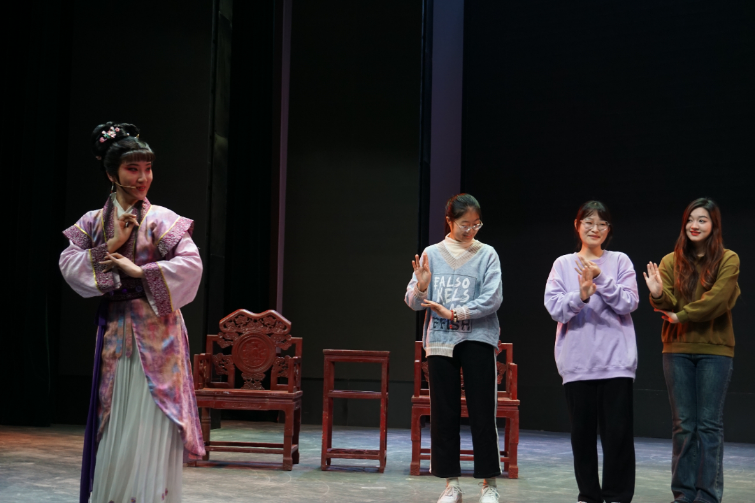 陶琪以通俗易懂的语言向同学们介绍了越剧的起源、发展,并通过现场演示和互动的方式,带领同学们一起体验戏曲的身段、唱腔,了解越剧的表演技巧和艺术魅力。