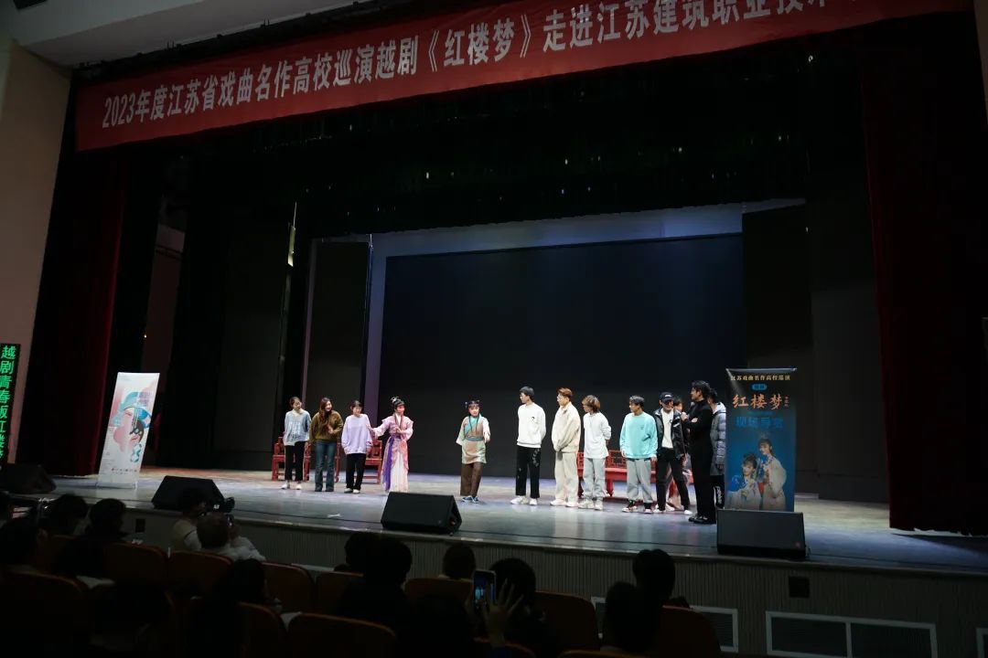 在开演前,江苏文艺广播主持人一潇为同学们进行剧目导赏,扮演“贾宝玉”的吉飞和扮演“林黛玉”的章琪上台,向同学们展现了新一代越剧演员的青春风采,并带领同学们互动。