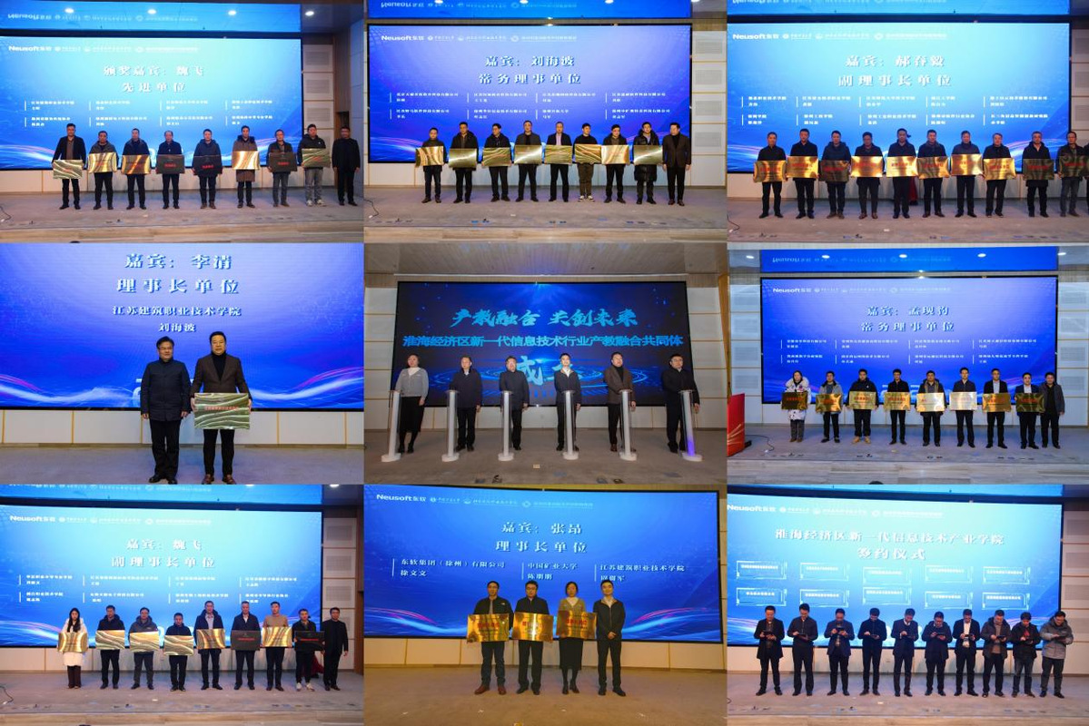 大会为职教集团的先进单位颁奖,为新一届理事长单位、副理事长单位、常务理事单位授牌,并为淮海经济区新一代信息技术行业产教融合共同体理事长、副理事长、常委理事单位代表授牌。