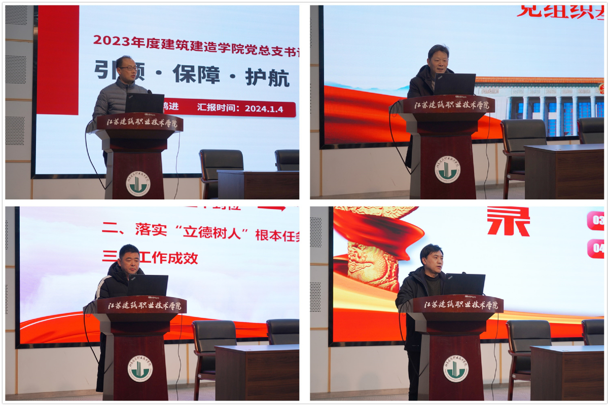 会前,各党总支、直属党支部书记向学校党委书记提交了书面述职报告。会上,建筑建造学院党总支、建筑管理学院党总支、智能制造学院党总支、经济管理学院党总支、离退休党总支、马克思主义学院党支部、图书馆党支部、继续教育学院党支部等8位书记进行了现场述职。述职紧扣基层党建难点堵点痛点问题,特别是主题教育总结评估和上年度查摆发现的问题,讲清履职尽责抓党建的硬招实招,既有党建成果展示和经验介绍,也有履职体会和工作分析。