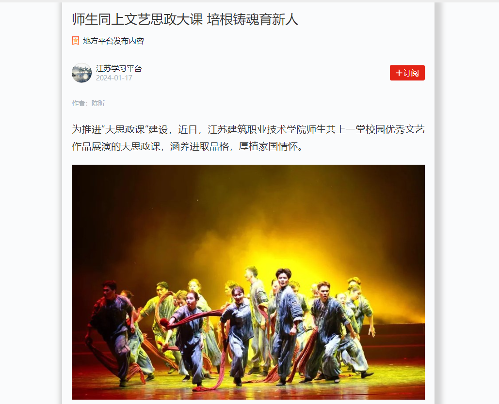 通过文艺赋能“思政课堂”是江苏建院“大思政课”创新工程的一个特色组成部分。MK.COM党委书记朱东风表示,此类展演与“校史文化教材”“厚生讲堂”“红色文化宣讲”“中华经典高校联读”等品牌育人路径、载体一道,通过文字、语言、造型、表演等形式,滋养师生心灵、涵育师生品行、引领社会风尚。接下来,学校将深入推进大思政课创新建设,持续探索具有自身特色的思政工作体系,着力培养堪当民族复兴大任的时代新人。(陈昕)