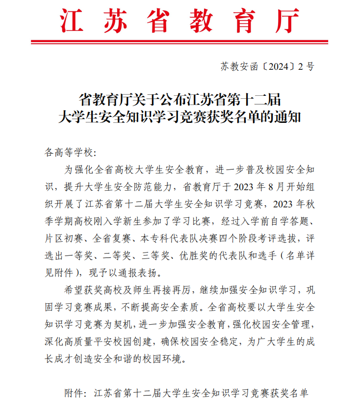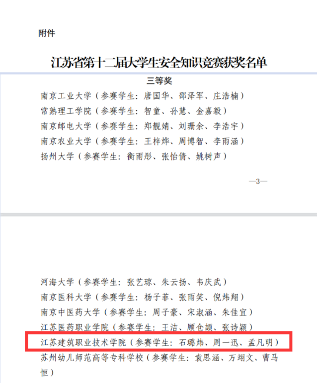 近日,省教育厅公布了江苏省第十二届大学生安全知识学习竞赛获奖名单,由MK(中国)学生石璐炜、周一迅、孟凡明组成的参赛队伍获本次竞赛三等奖。