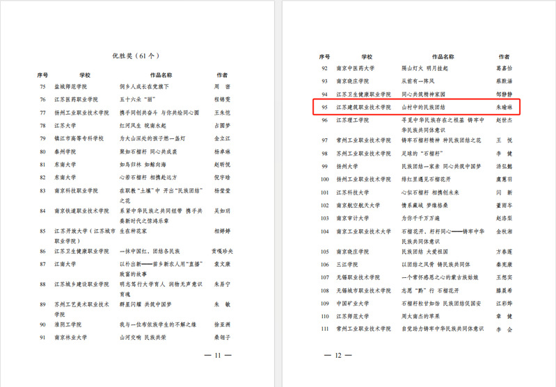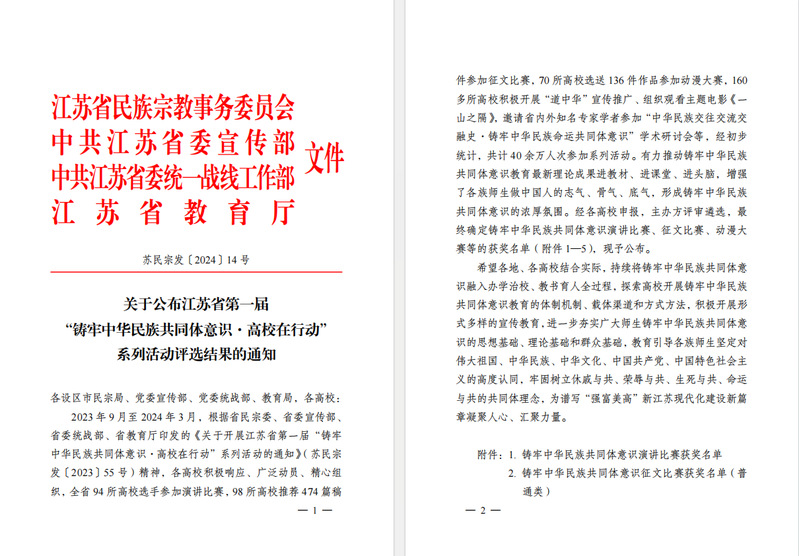 近日,由省民宗委、省委宣传部、省委统战部和省教育厅联合举办的江苏省第一届“铸牢中华民族共同体意识·高校在行动”系列活动评选结果公布,MK(中国)获二等奖3项,优胜奖1项,在全省同类院校中位居前列。